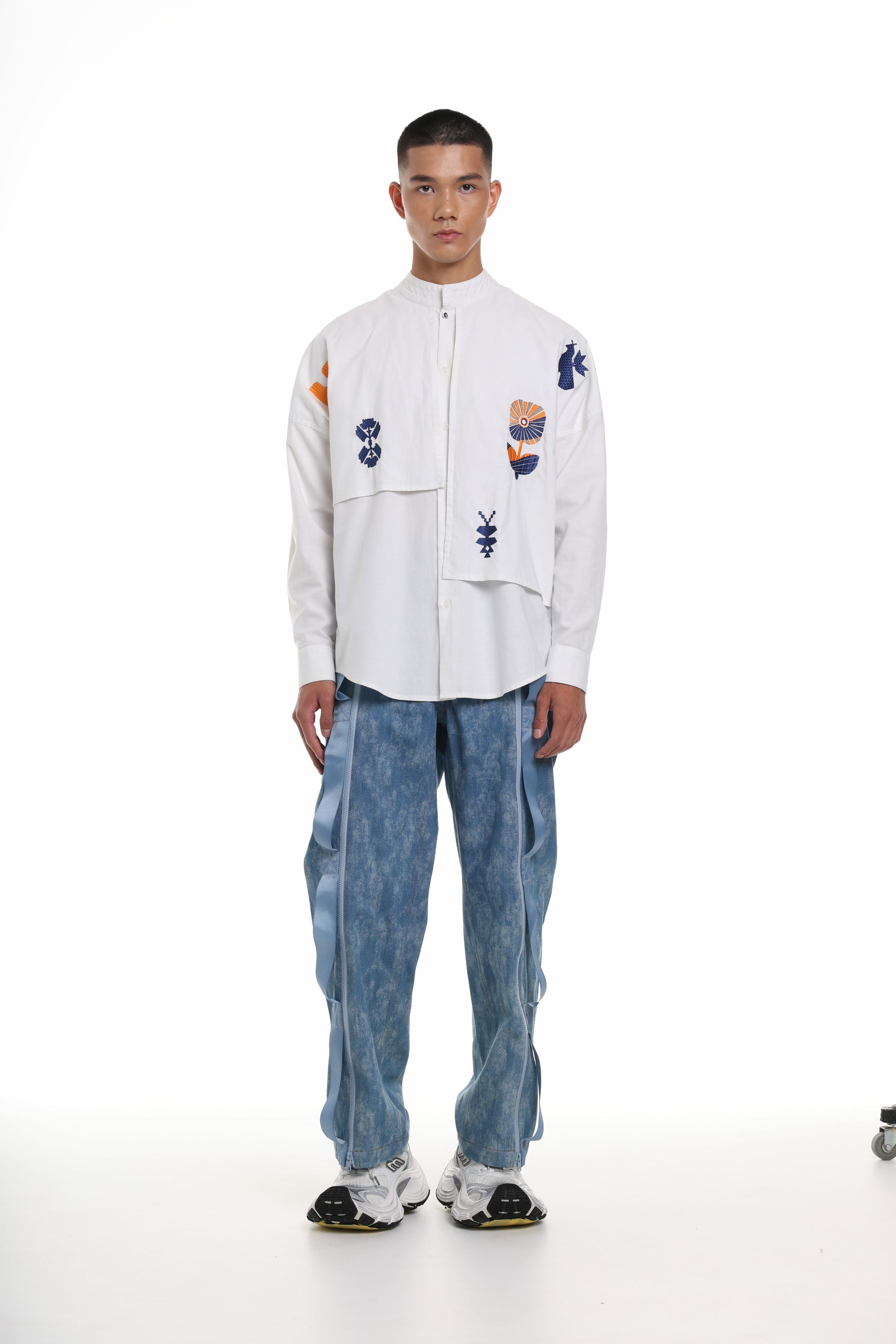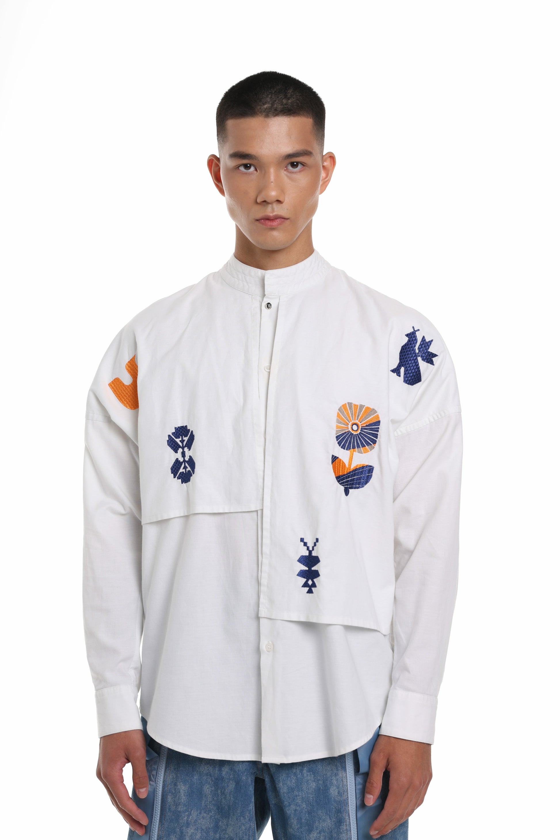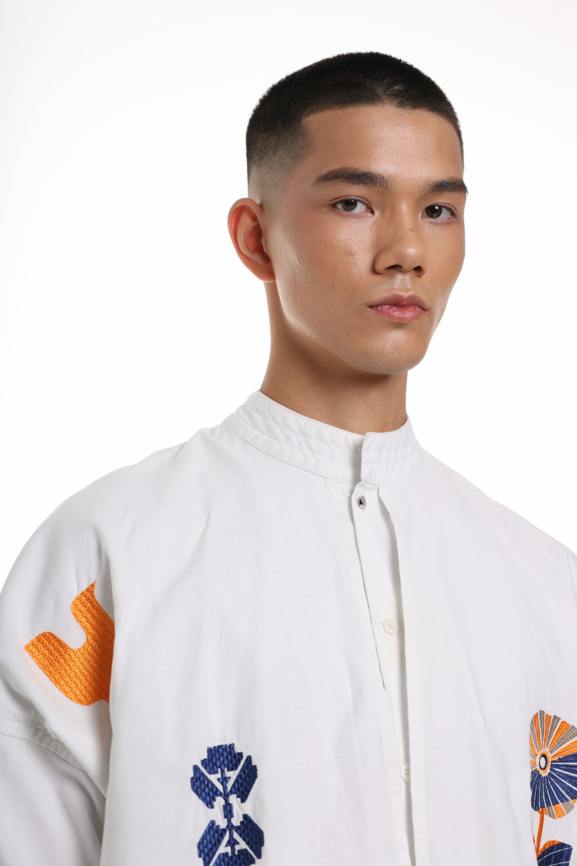 Сорочка з акцентною машинною вишивкою у стилізації Дерева життя — символічний елемент, що формує характер моделі. Контрастні вишиті деталі у відтінках синього та помаранчевого створюють виразний графічний акцент на білому полотні.
