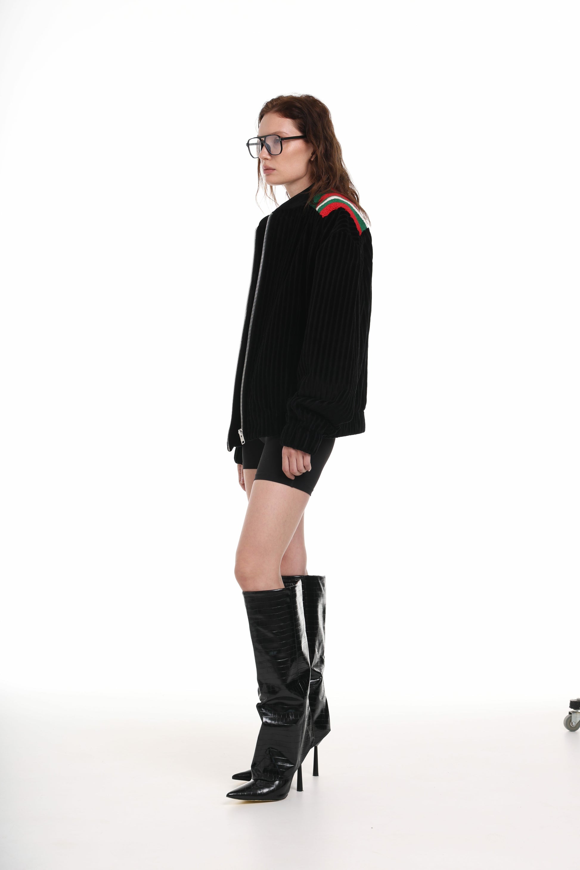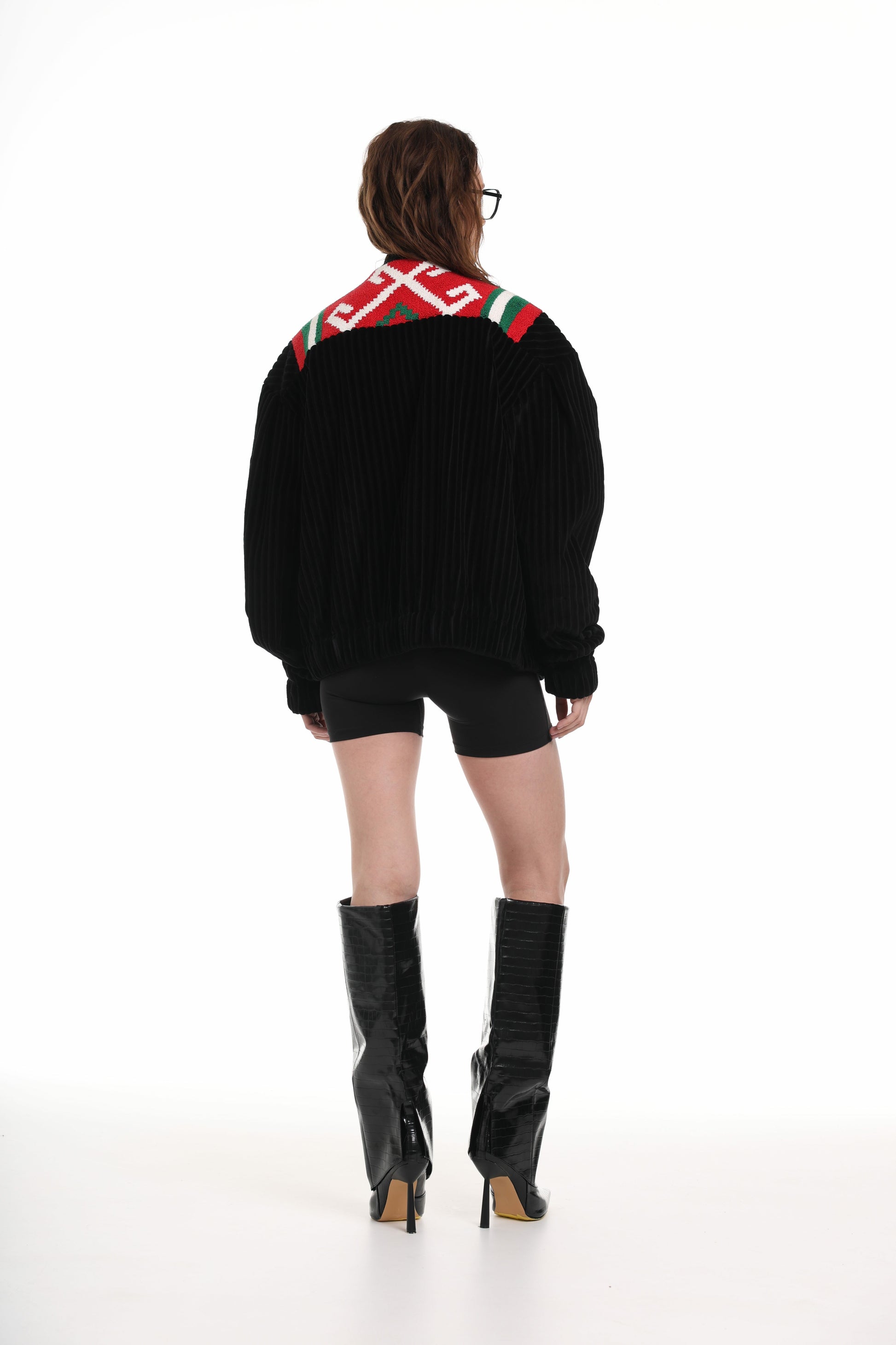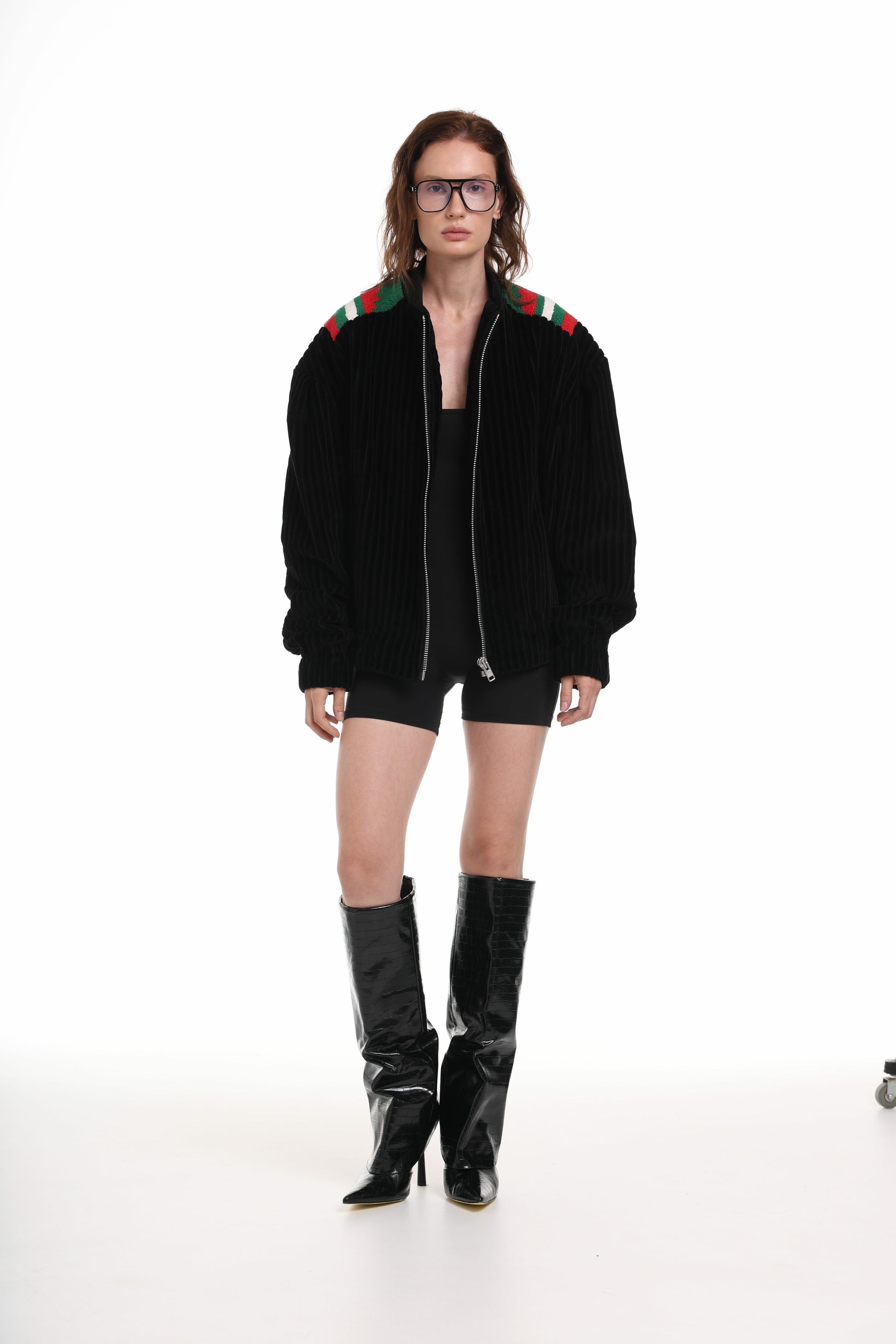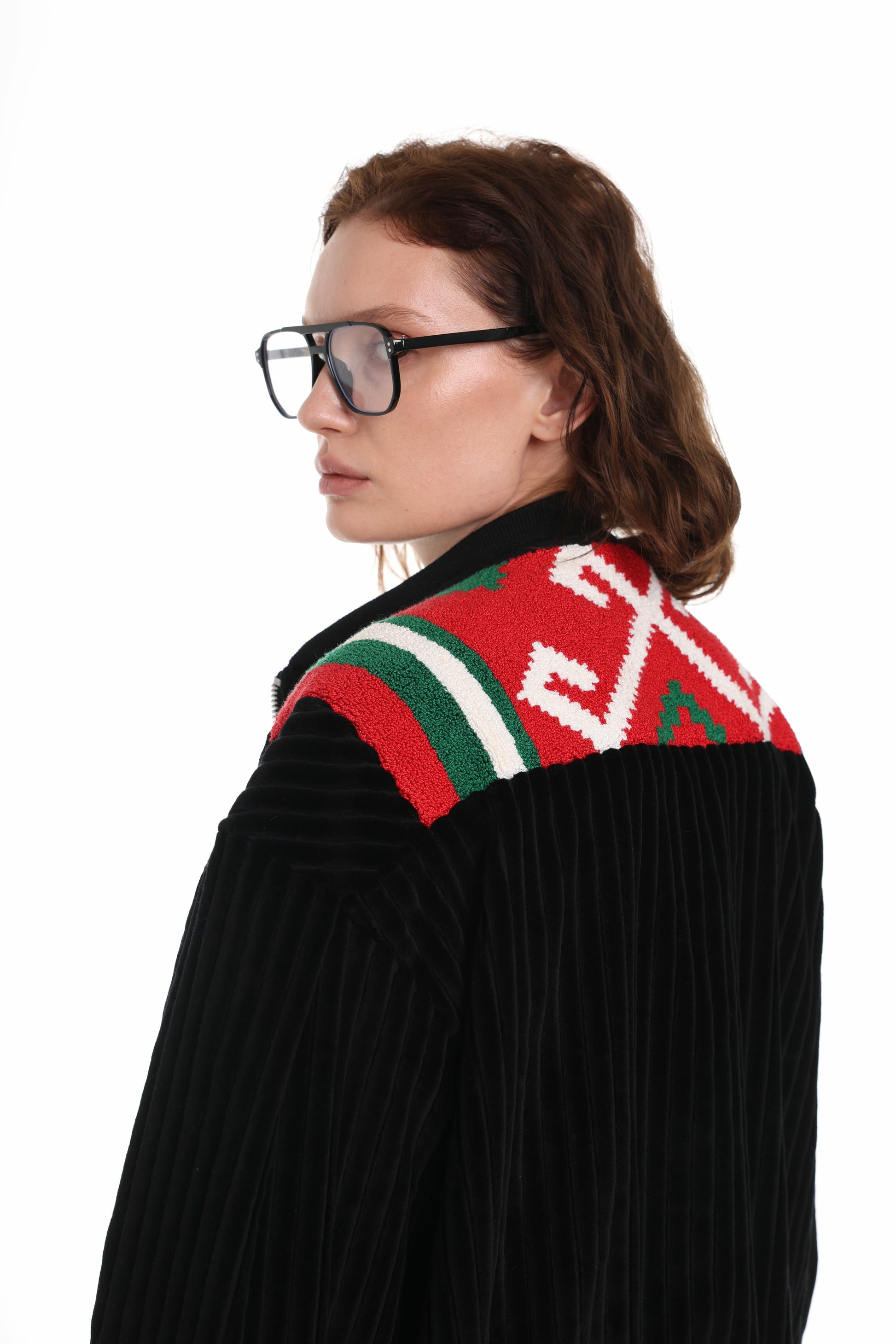 Чорний бомбер із виразною декоративною кокеткою, виконаною вручну в техніці Gobelin. Етнічні елементи та давні сварги формують характер моделі та роблять її впізнаваною.