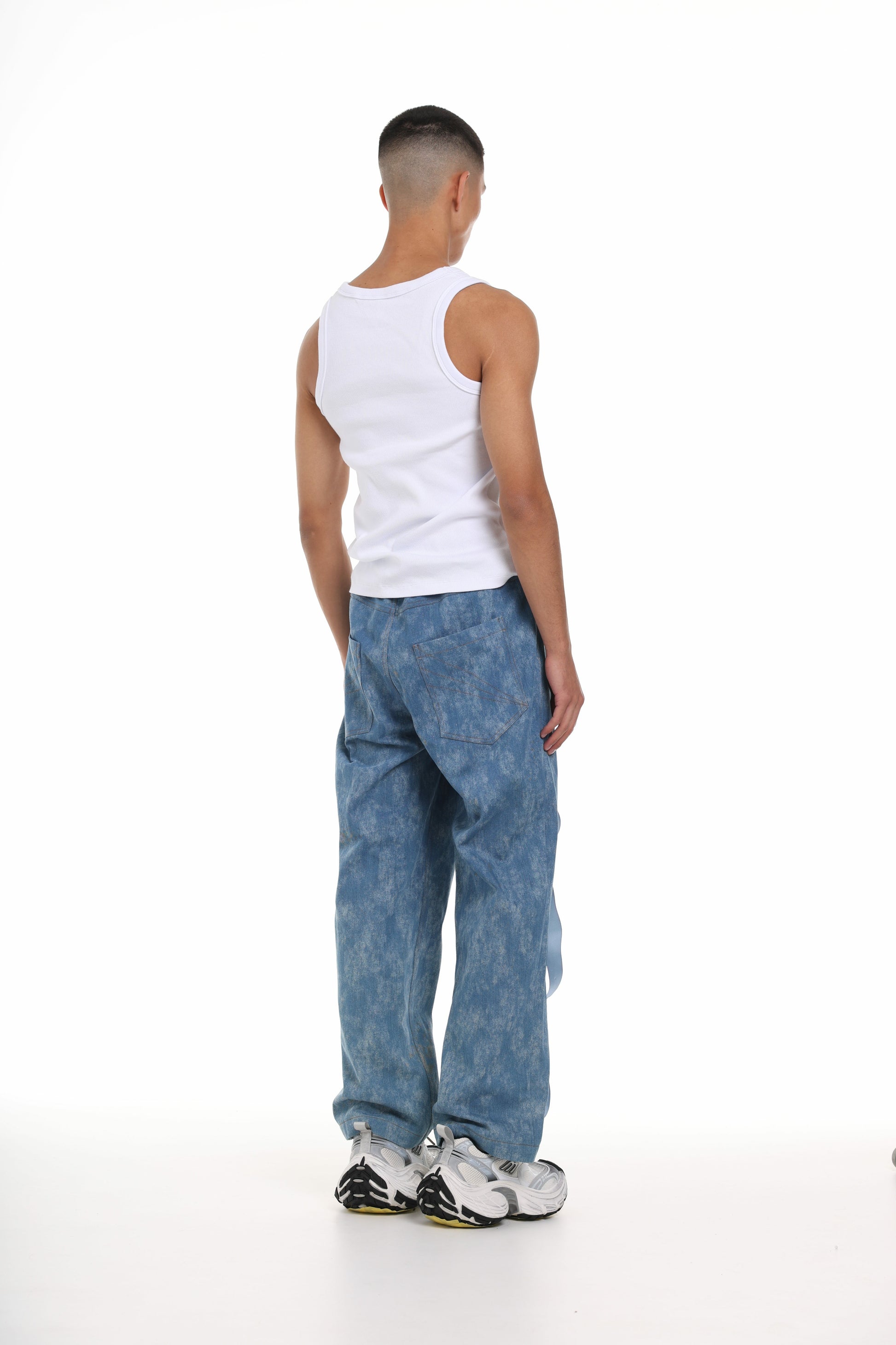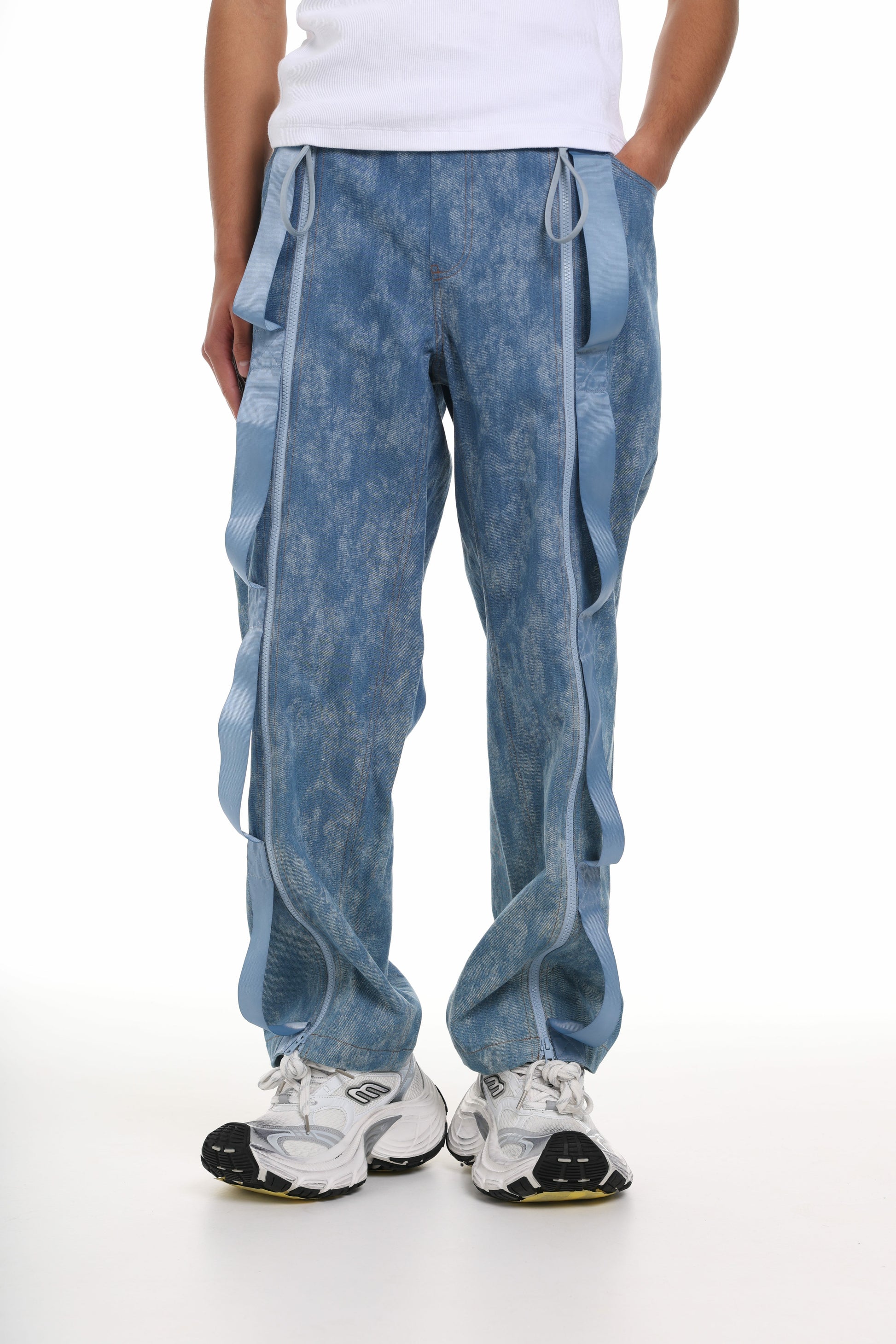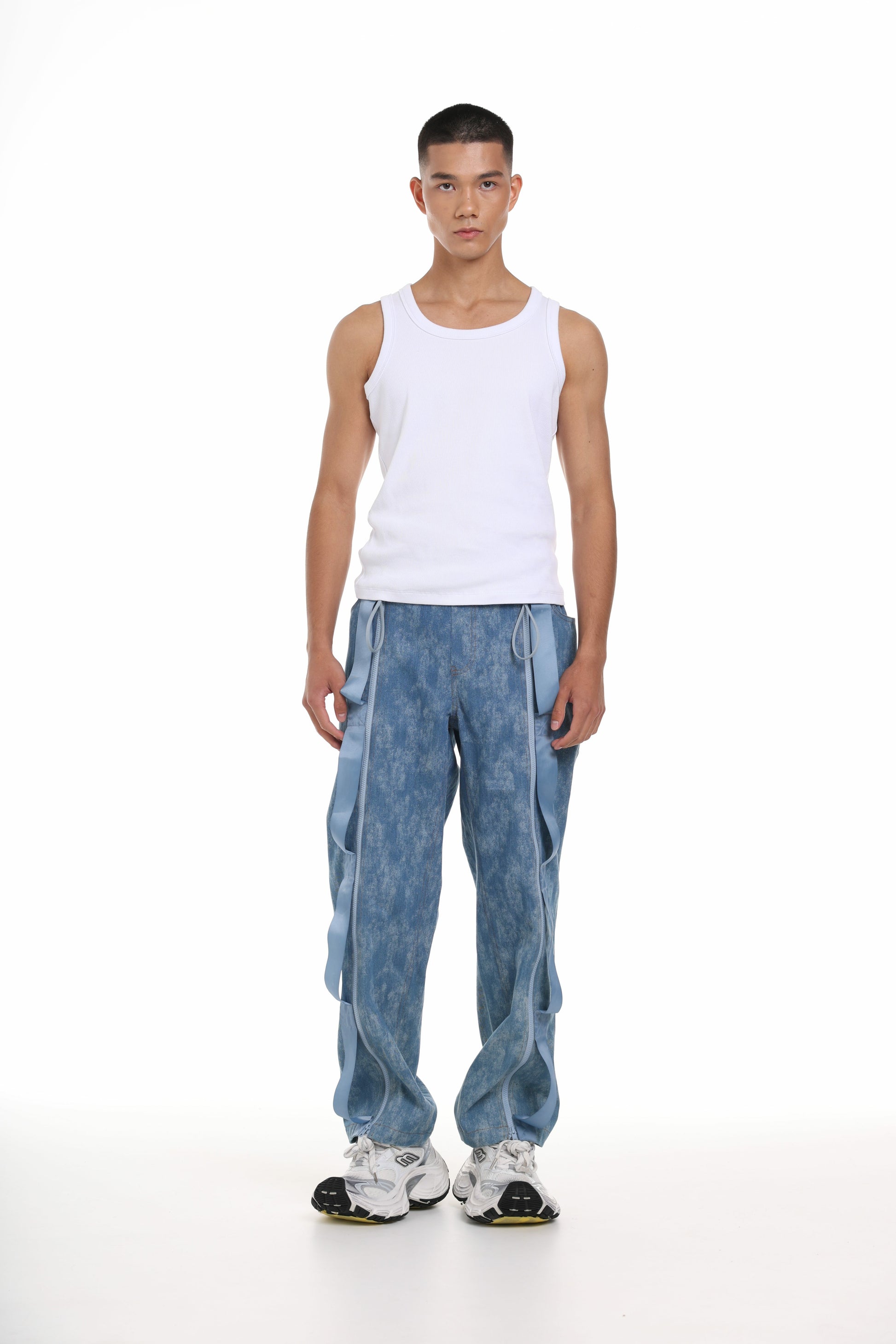 Акцентні карго-джинси зі світло-блакитного деніму з декоративними хлястиками вздовж бокових швів. Модель створює обʼєм і рух — навіть у статичному образі.