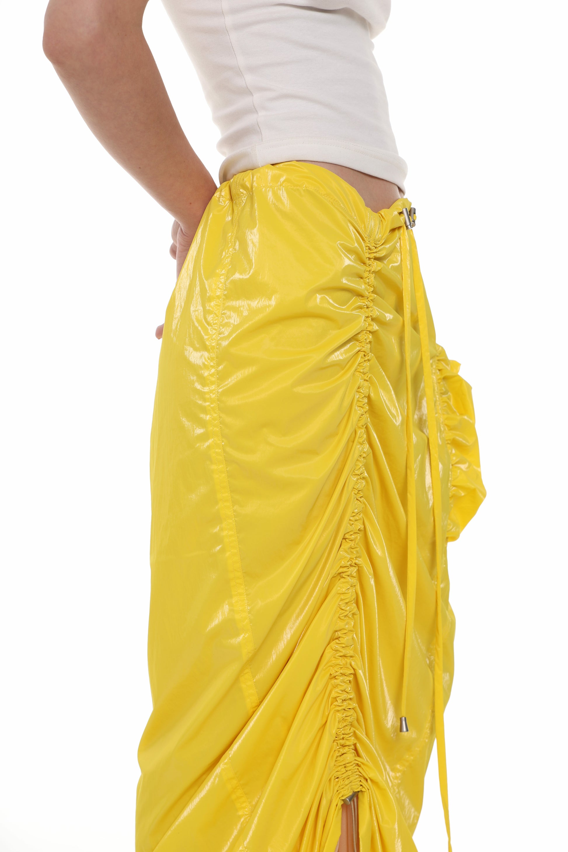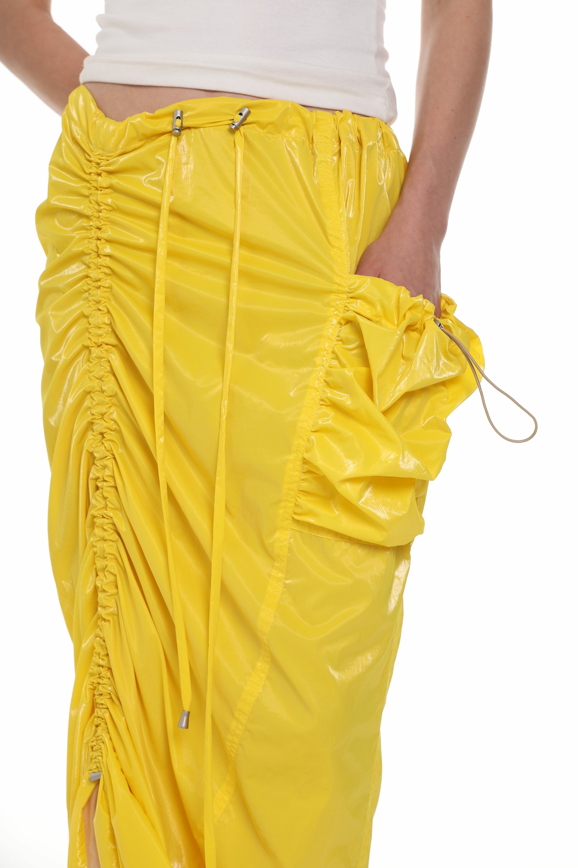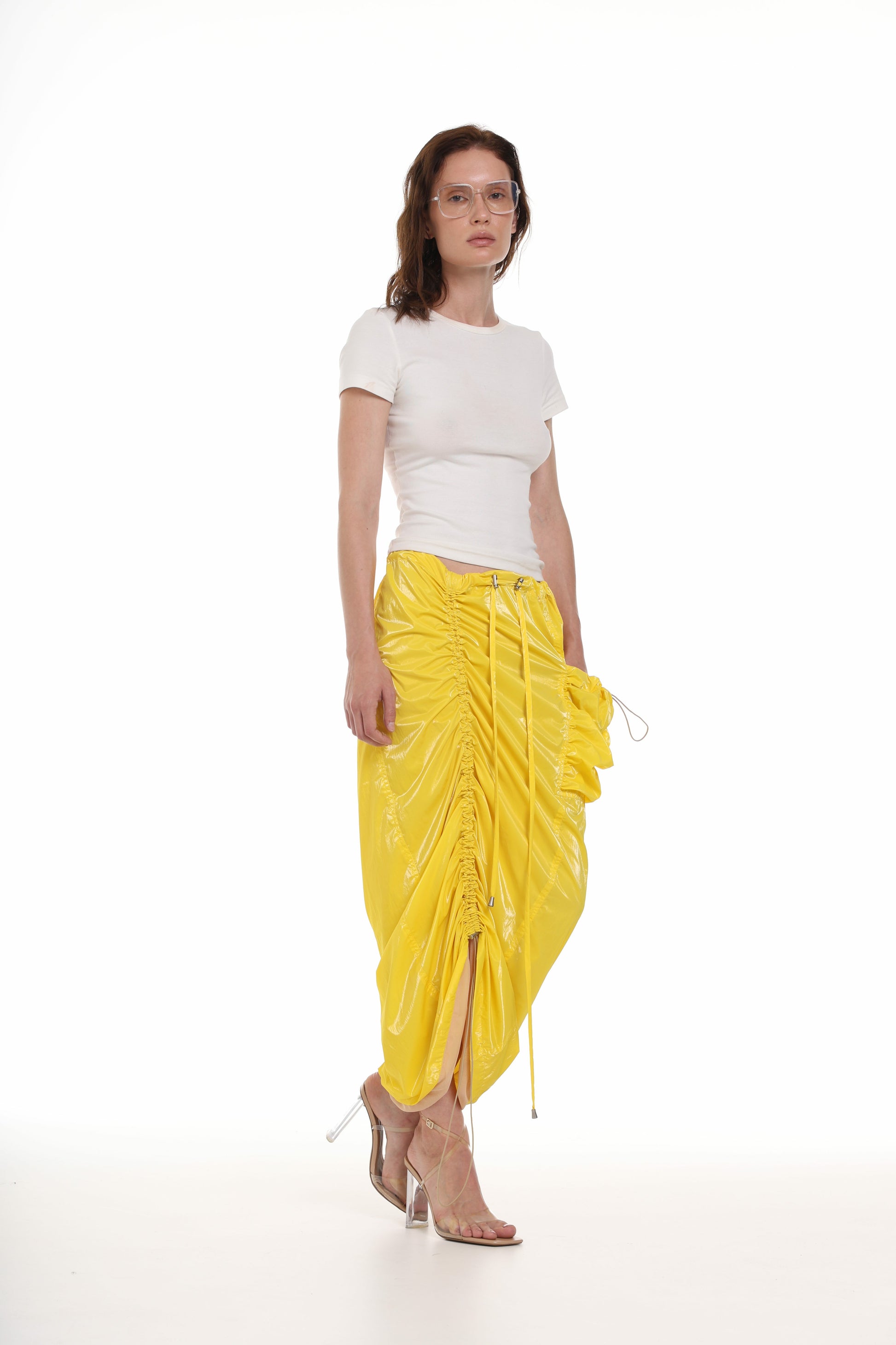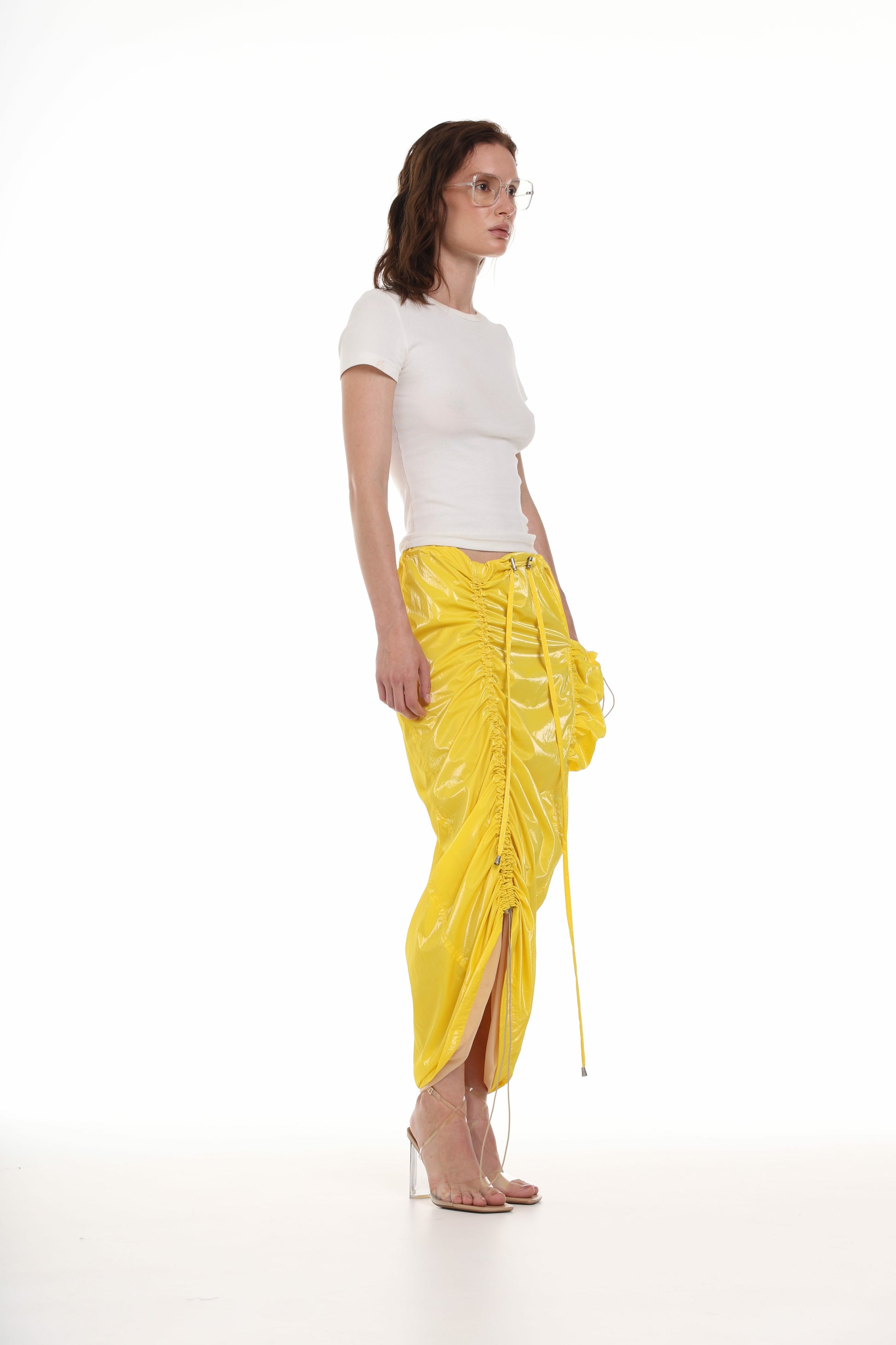 Акцентна спідниця у яскравому жовтому кольорі, що формує виразний силует завдяки регульованим елементам. Декор у вигляді еластиків, люверсів і металевих наконечників додає моделі динаміки та сучасного характеру.